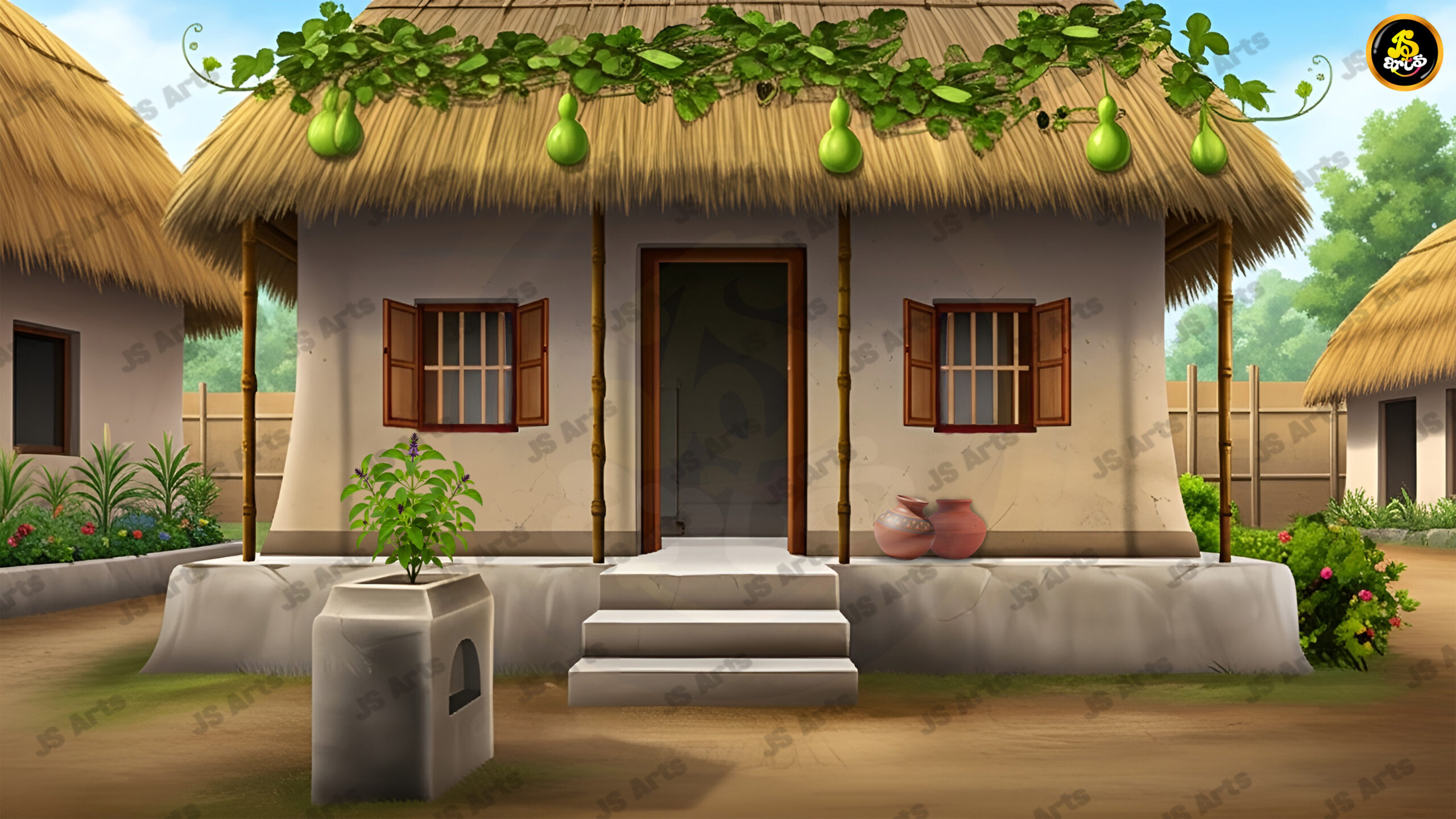• Visual Details: The centerpiece is the Tulsi Plant (Holy Basil) in a traditional square planter, a symbol of an Indian household. The thatched roof is decorated with a Bottle Gourd Vine (Lauki ki Bel), showing a self-sustaining lifestyle.
